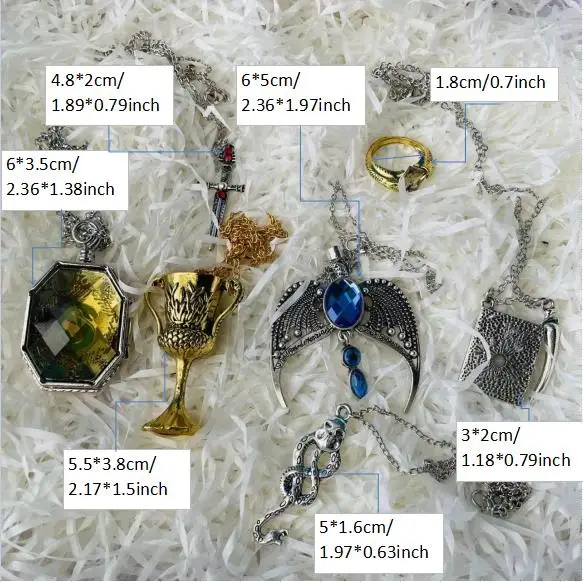 7 pcs of set is including : 1 pc Slytherin Locket + 1 pc Ravenclaw Diadem necklace +1 pc Hufflepuff cup necklace + 1 pc Marvolo Gaunt rings + 1 pc Slytherin diary necklace + 1pc Gryffindor sword necklace + 1 pc Death Eater necklace